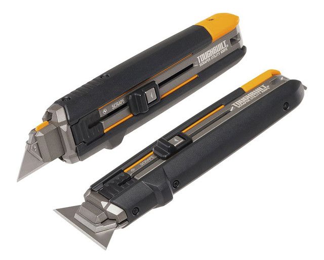 - Використовує запатентований механізм ToughBuilt, що дає змогу легко перетворити канцелярський ніж на скребок одним натисканням великого пальця.