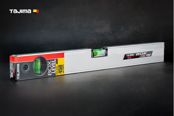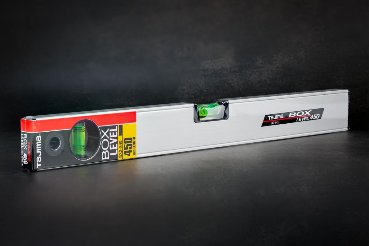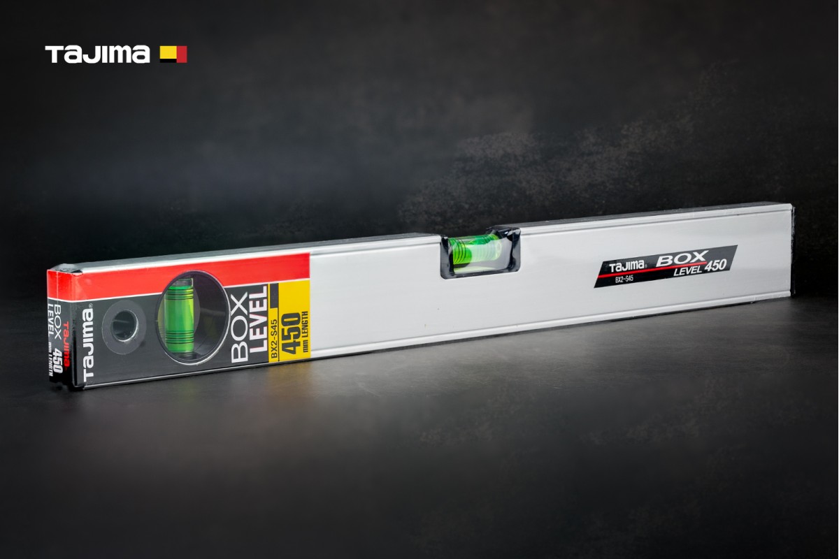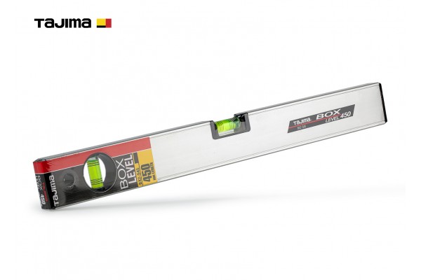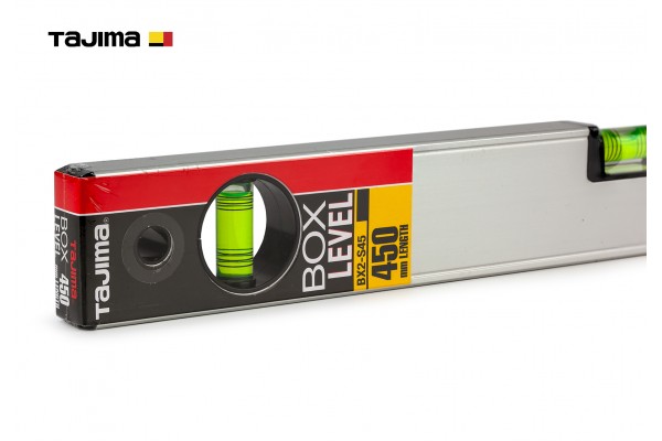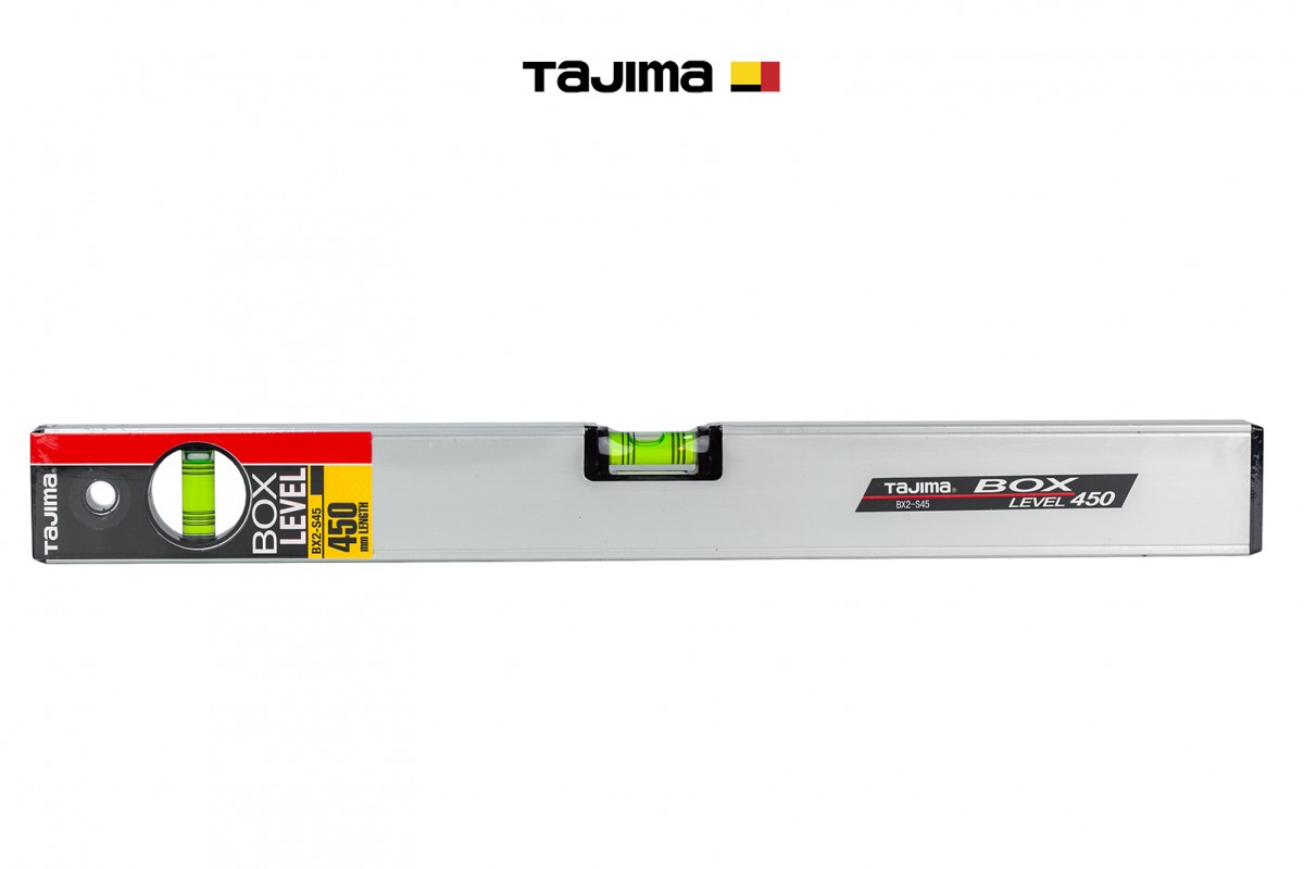 TAJIMA BOX BX2-S45 — професійний будівельний бульбашковий рівень довжиною 450 мм, призначений для високоточного контролю горизонтальних і вертикальних поверхонь під час будівельних, монтажних та оздоблювальних робіт.